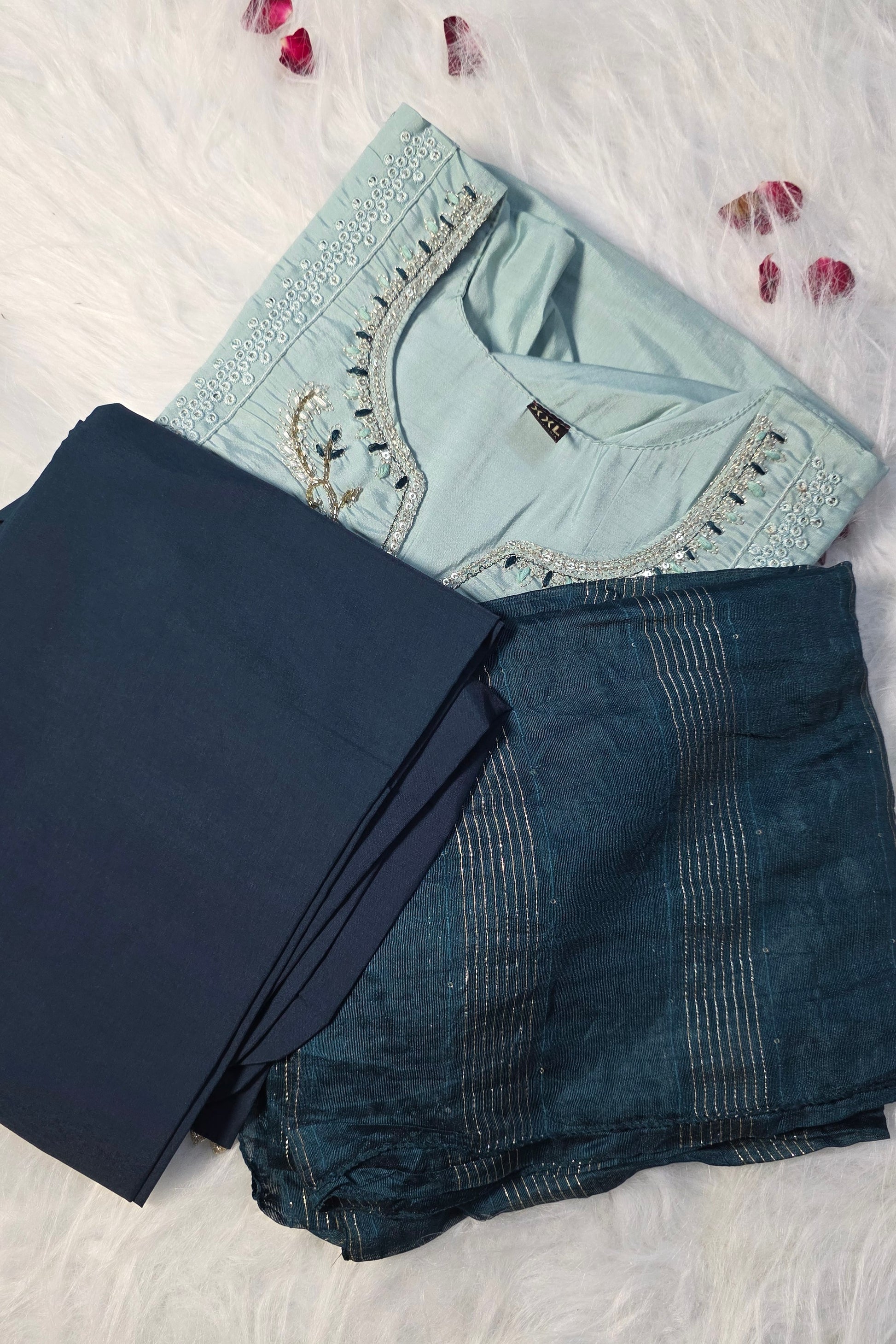 Embrace sophistication with the โจ Elegant Sky Blue Embroidered Suit Set โจ. Perfect for any occasion, itโs more than just a suit; itโs a ticket to elegance. Wear it proudly and express your unique style!