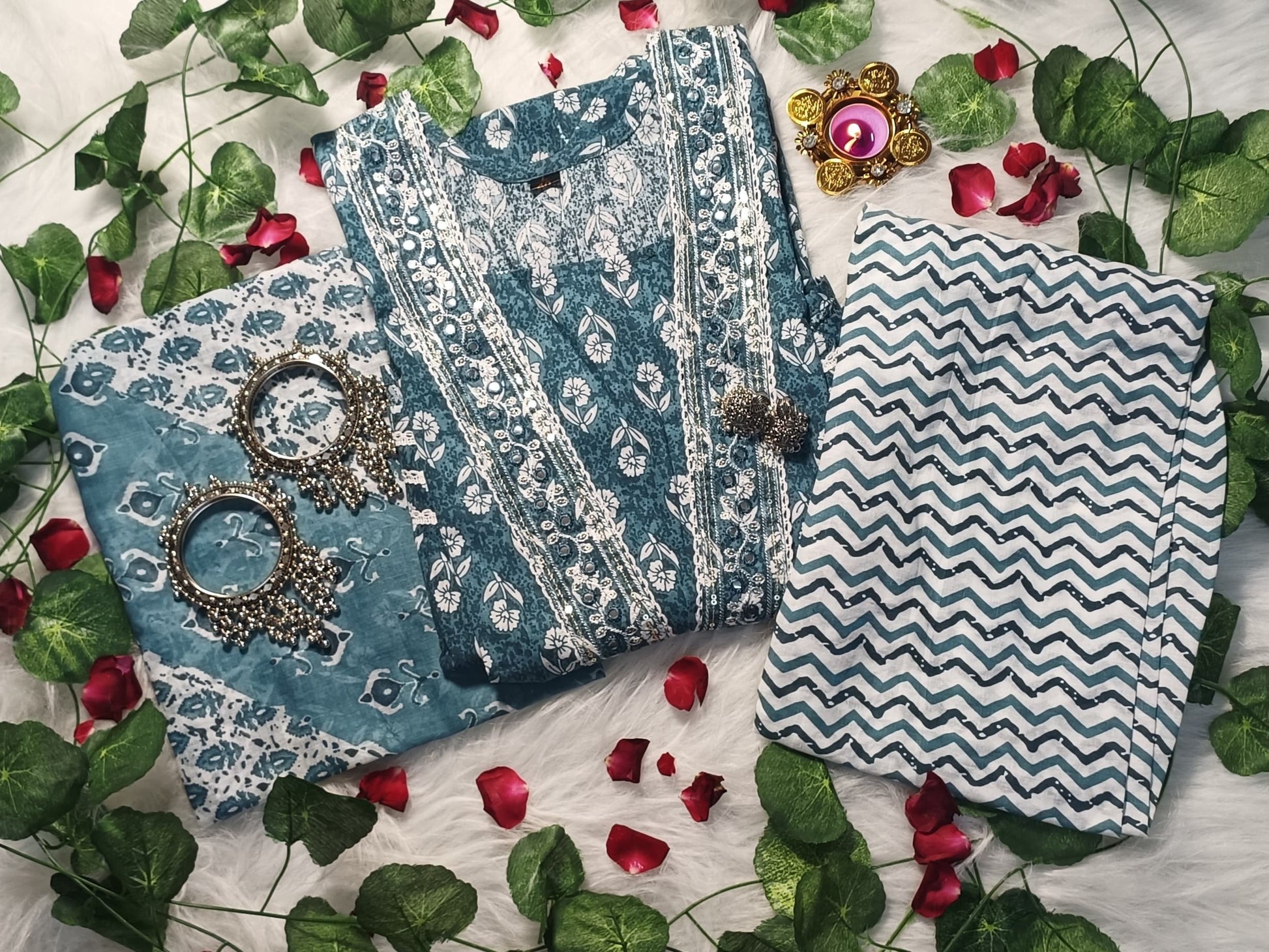 Kurta: Deep teal base adorned with delicate floral block prints and intricate lace work on the neckline and sleeves for a refined, regal touch.