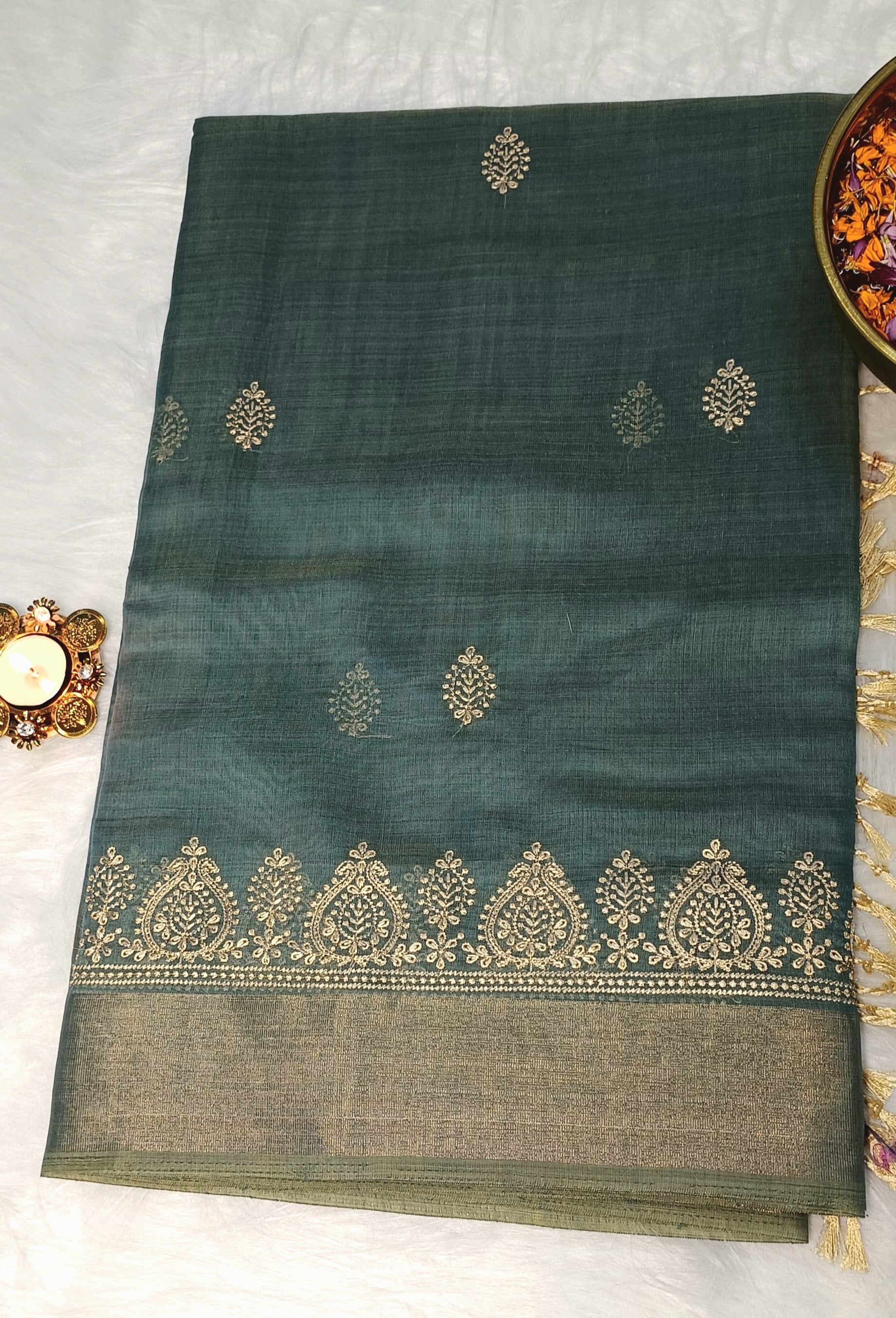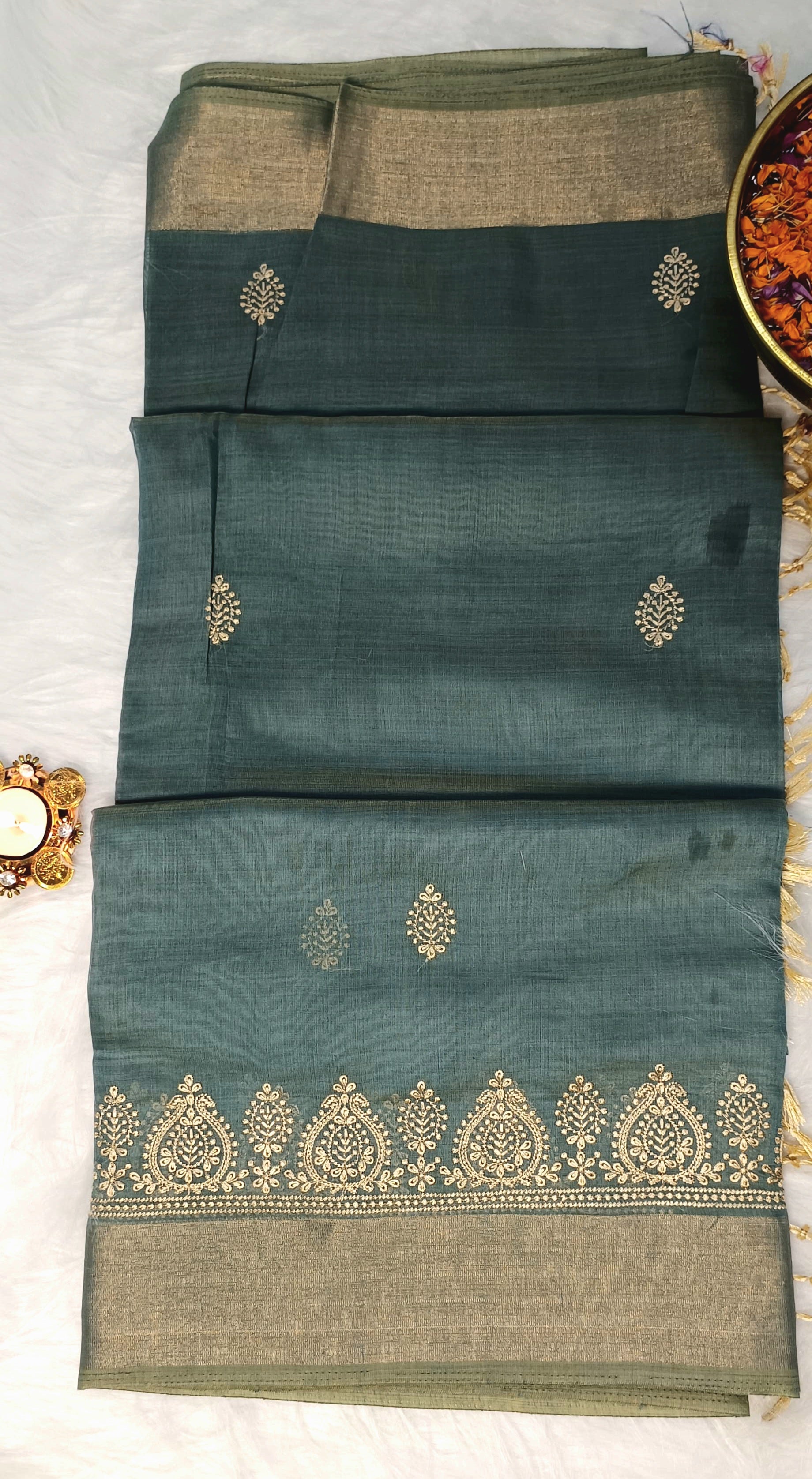 Teal Green Cotton Saree with Golden Embroidery & Zari Border